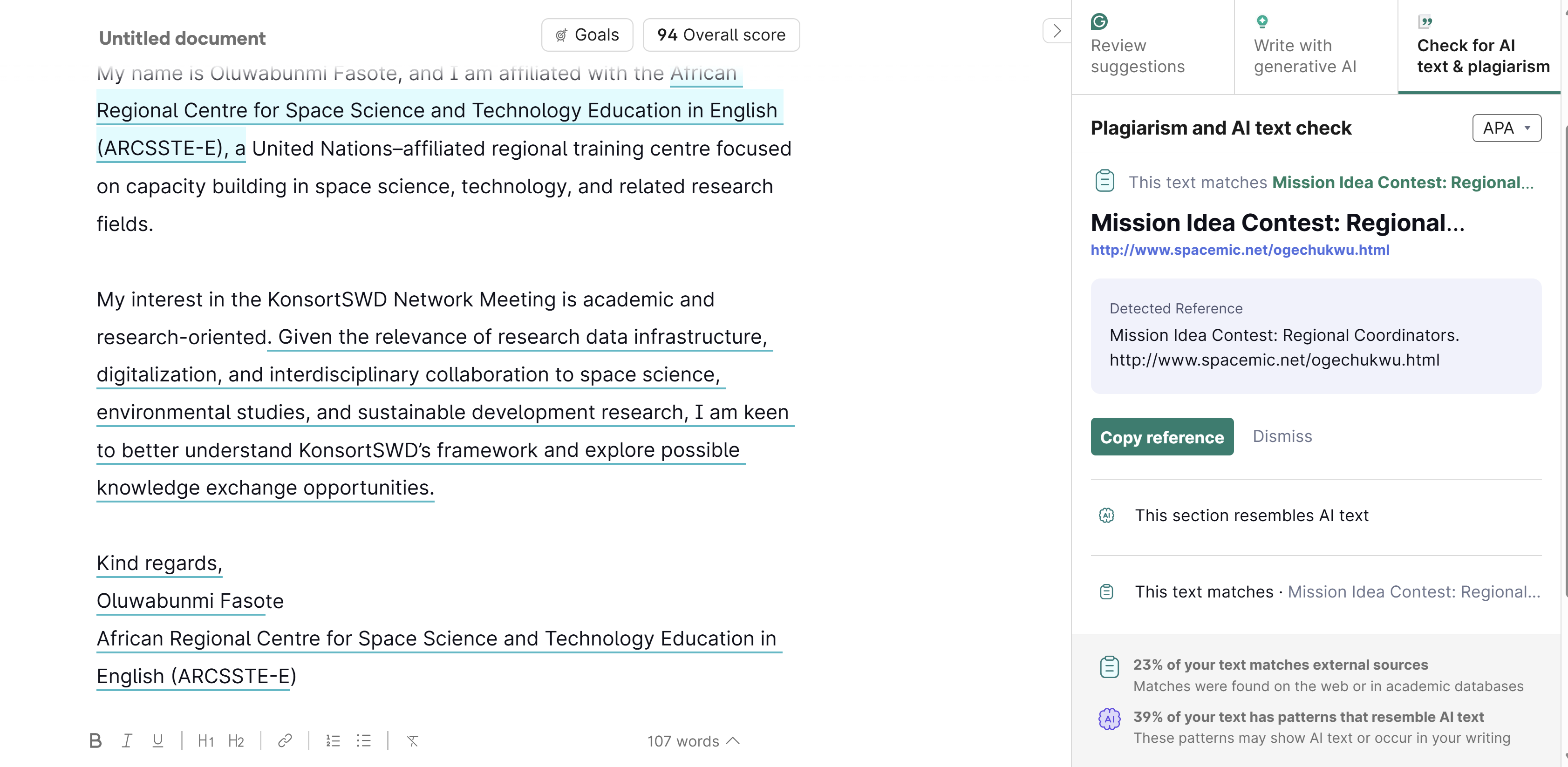 My name is Oluwabunmi Fasote, and I am affiliated with the African Regional Centre for